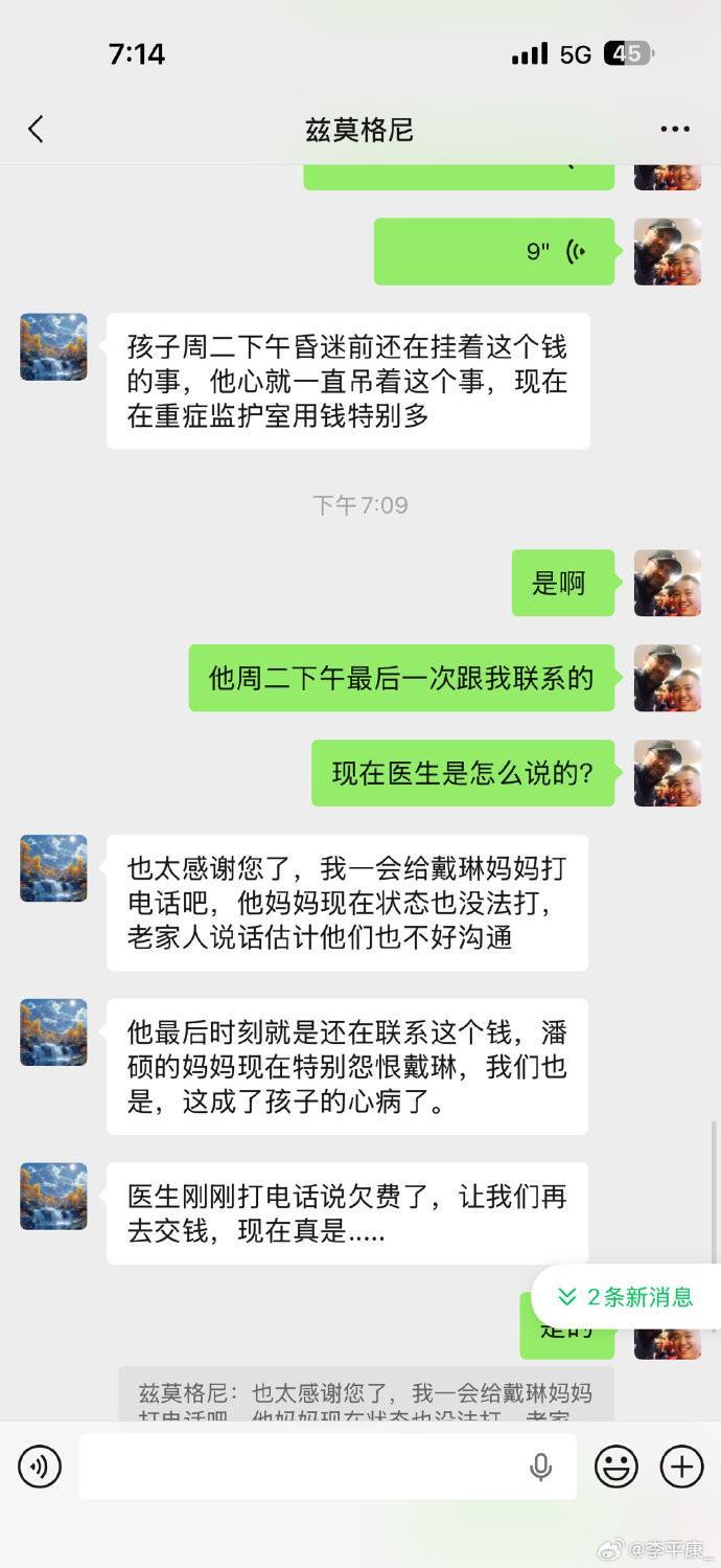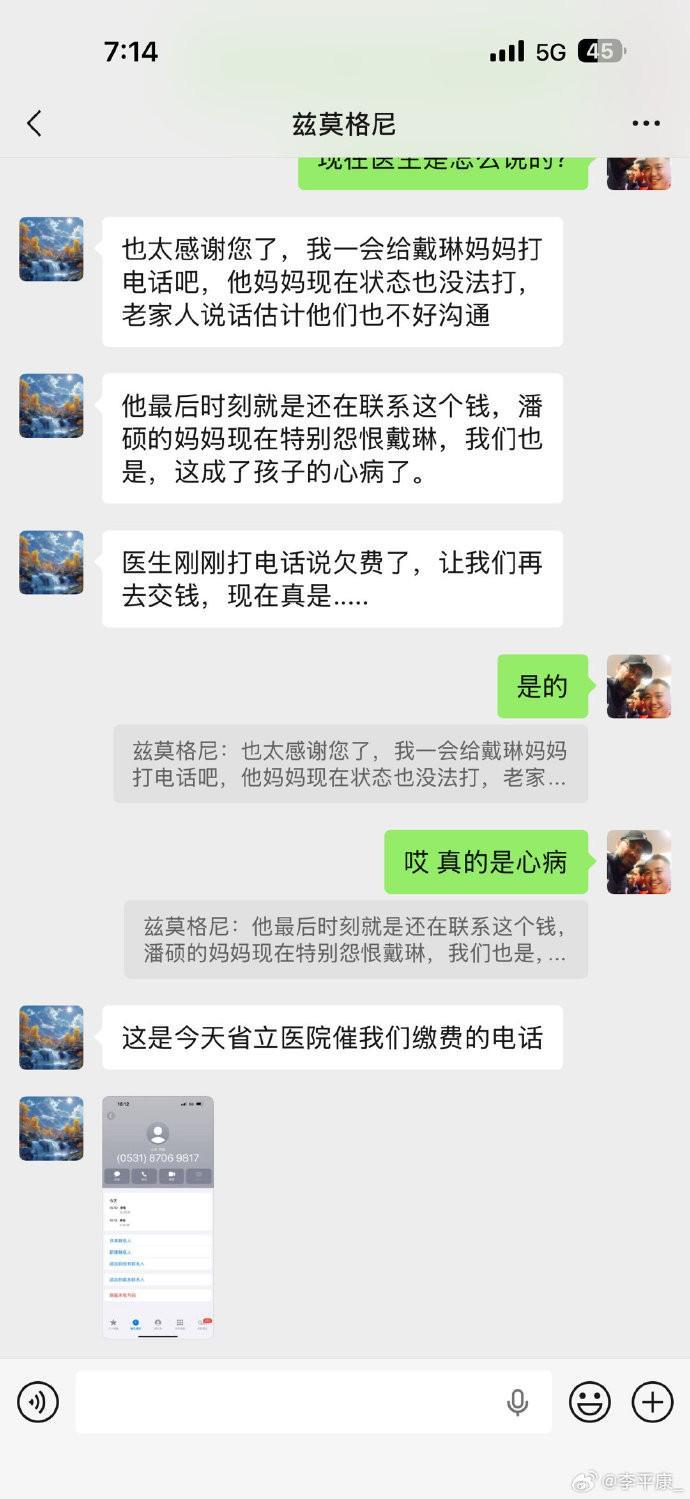 今天他的姑姑受他父母委托,打開他的手機(jī)和我取得了聯(lián)系。小潘目前情況很不樂(lè)觀,已經(jīng)昏迷四天,在icu每日花費(fèi)巨大。而讓家人難以釋懷的是,昏迷前一刻,小潘還一邊和我溝通,一邊向戴琳討債!善良厚道的小潘一直沒(méi)有把這件事告訴父母,他的家人也是今天打開手機(jī)之后才了解到這個(gè)情況。