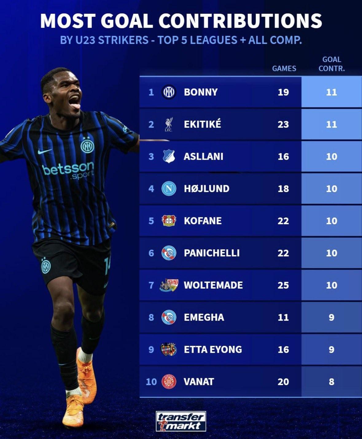 本賽季五大聯(lián)賽U23前鋒直接參與進球前10:博尼、埃基蒂克第1